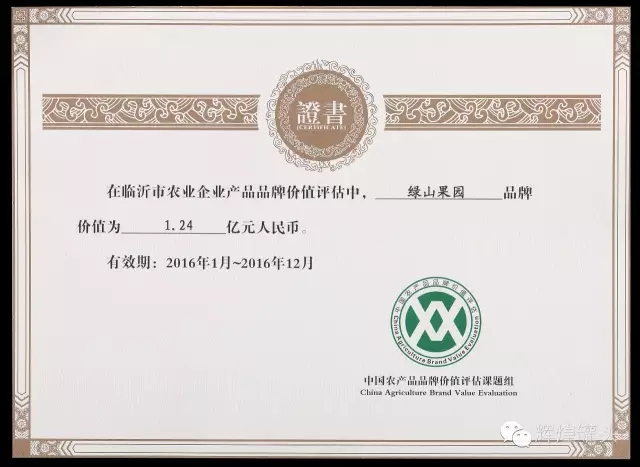 熱烈祝賀輝煌公司再獲殊榮“綠山果園品牌價1.24億元